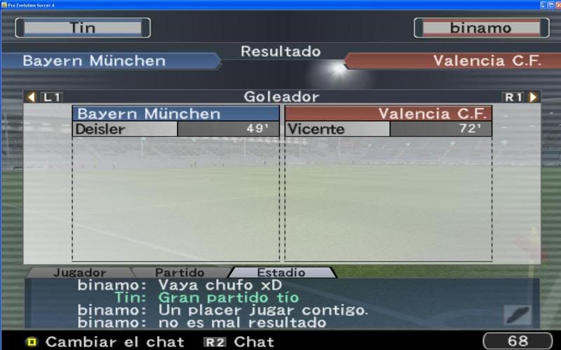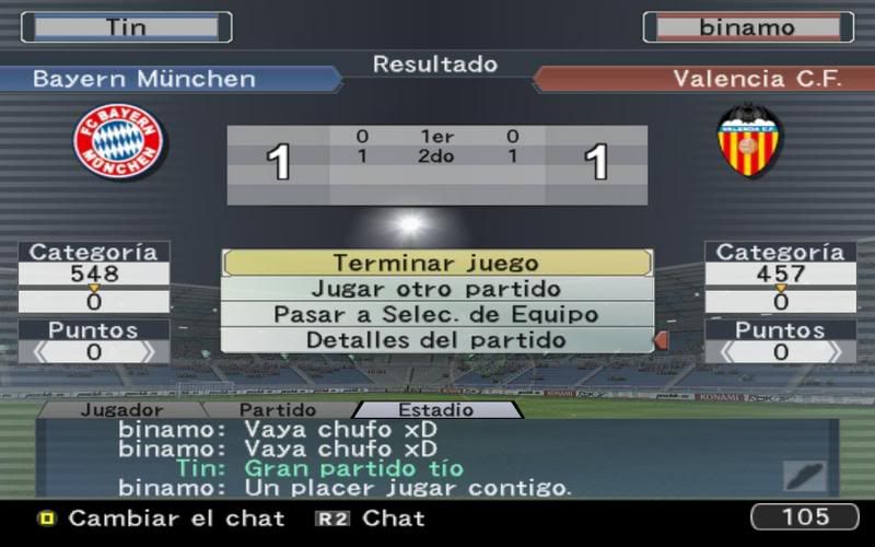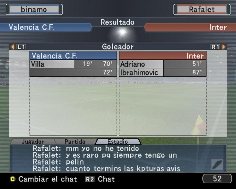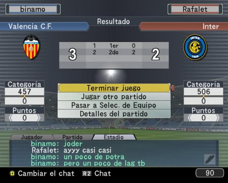 Ahora en serio migue, no te cortes pisha, me has dado un baño acojonante y he tenido unos de los partidos con mayor suerte que jugado en el PES, me has tirado de todos lados, y he tenido la suerte de que siempre había un defensa o el portero para salvarme el culo. Mi primero gol si fue una buena jugada al primer toque pero el segundo un verdadero churro rocambolesco que terminas metiendo dentro de tu propia portería con una cara de impotencia que debías de tener pasmosa.