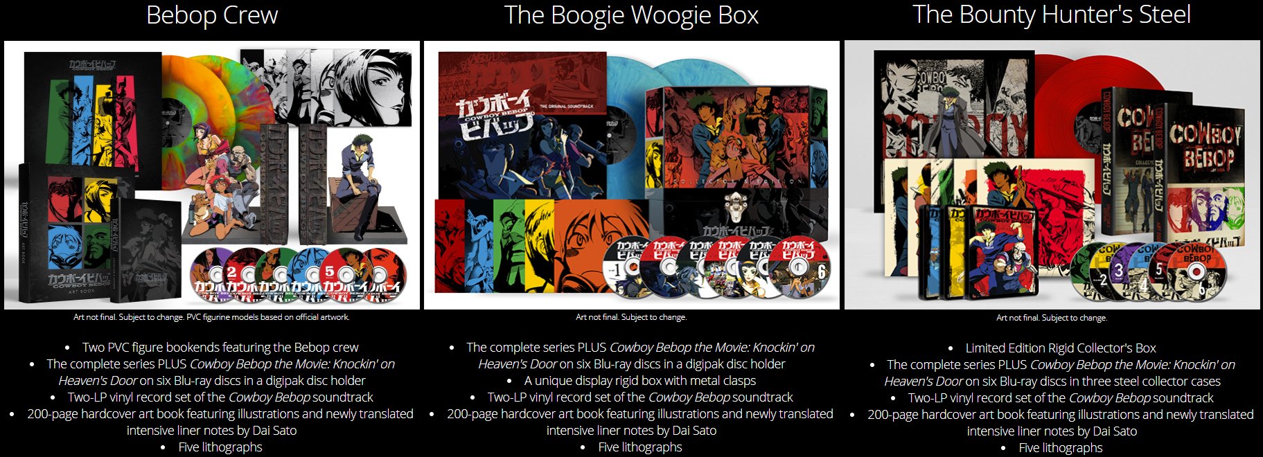 No sé qué piensan hacer con Cowboy Bebop, ni que ediciones están saliendo por Europa, pero la que imita una colección de vinilos que compré hace unos años es muy buena.
