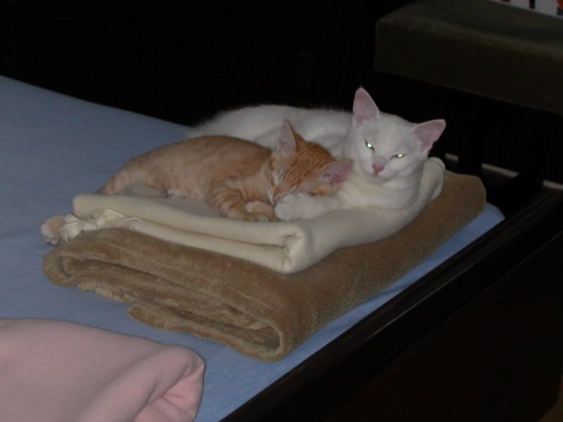Aquí unas fotos de los míos. Estos son Kimba (la de pelo blanco) y Tigger (el atigrao). Se quieren con locura. No hay más que verlos :amor