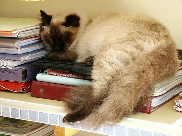 Ahí está, durmiendo plácidamente en la estantería. Claro... se pasa la p@@a noche dando guerra y por el día, el muy guarro, se mete unas panzadas de dormir... :cabreo