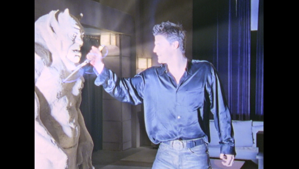 La posterior pelea entre Buffy y Angel, usando ambas espadas, revela los problemas de los famosos dobles de BVS: el que hace de Angel tiene un peinado evidentemente distinto a Boreanaz, pero bueno...