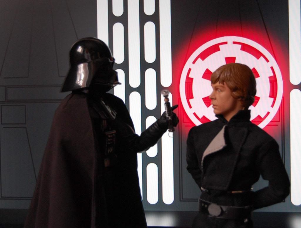 me encantan detalles como Vader subiendo la escalera con Luke arriba poderoso...justo al reves de como lo vemos en el imperio...,Vader arriba y luke subiendo esa escalera,hago dioramas con mis muñecos xD,si...estoy muy mal...mi novia me mira raro xD: