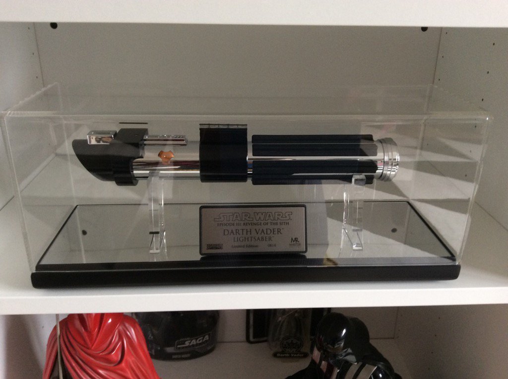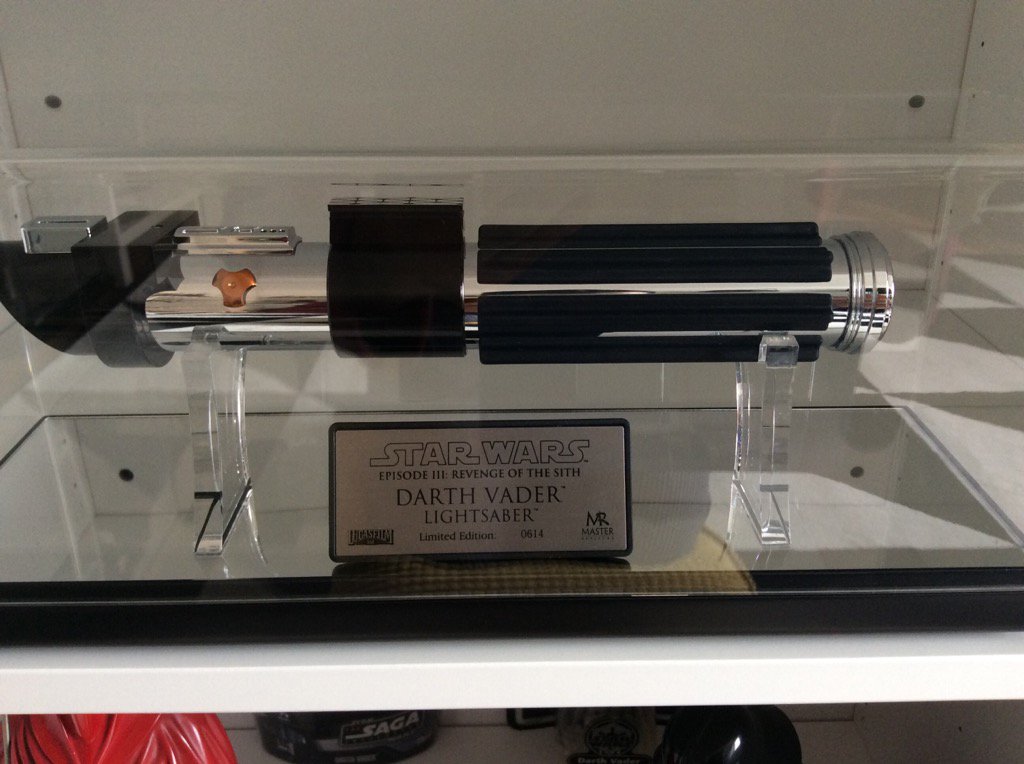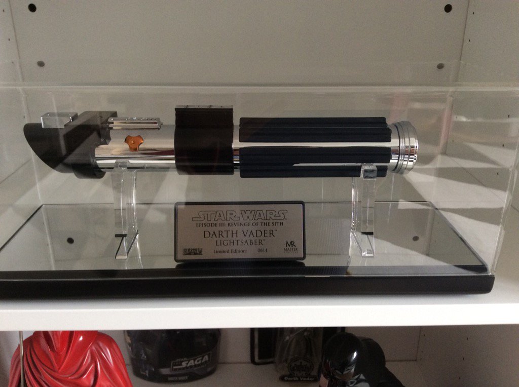 Réplica sable láser LE Darth Vader Episodio III de Master Replicas No hay mucho que decir de esta joya, totalmente nueva y con una presentación de lujo, me encanta Master Replicas porque cuida la presentación hasta el más minimo detalle, los acabados del mango no tienen nada que ver con uno de FX, la base espejo, la vitrina, la placa, hasta un paño fino para limpiarla.