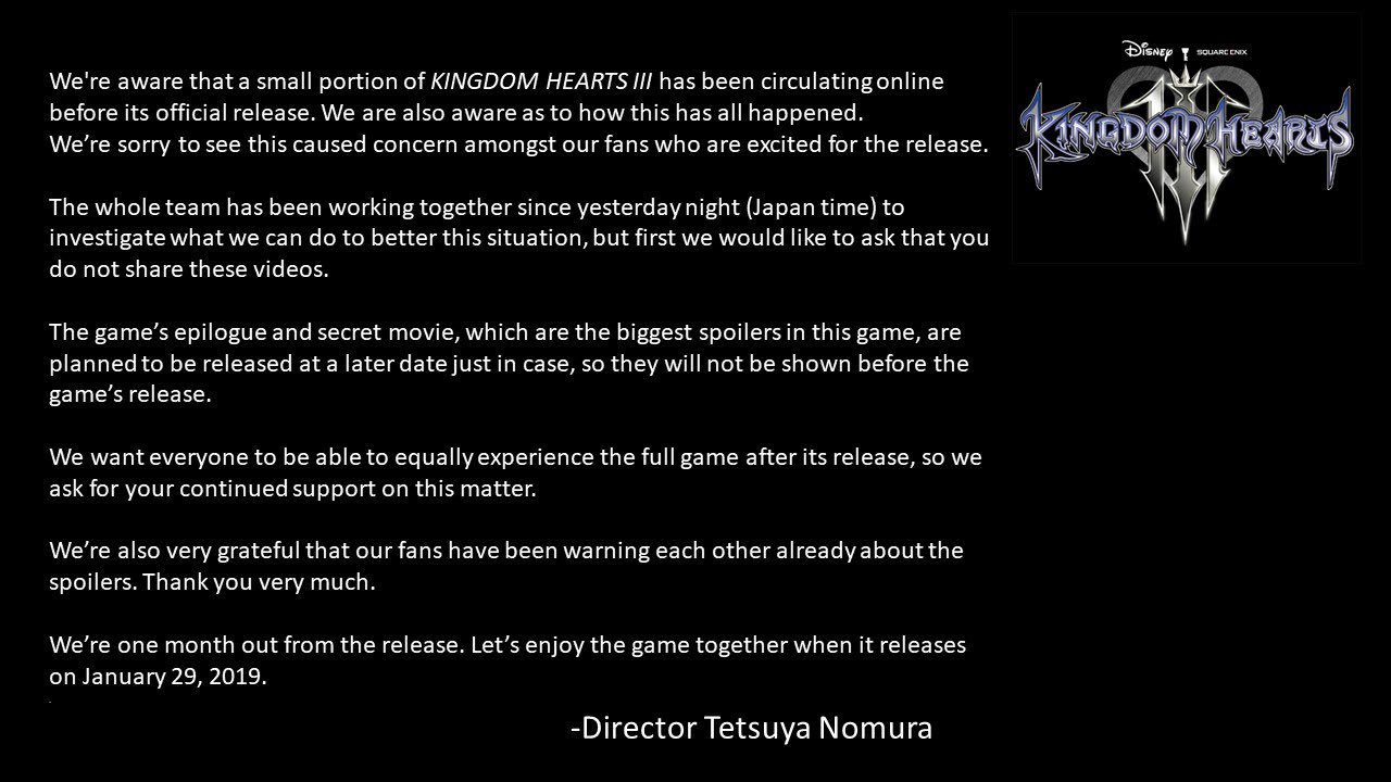 "Nos hemos enterado de que una pequeña parte de KINGDOM HEARTS III ha salido a la luz en internet antes de su lanzamiento. También sabemos cómo ocurrió todo esto. Pedimos disculpa de que esto haya causado preocupación entre los fans que no pueden esperar al lanzamiento del juego.