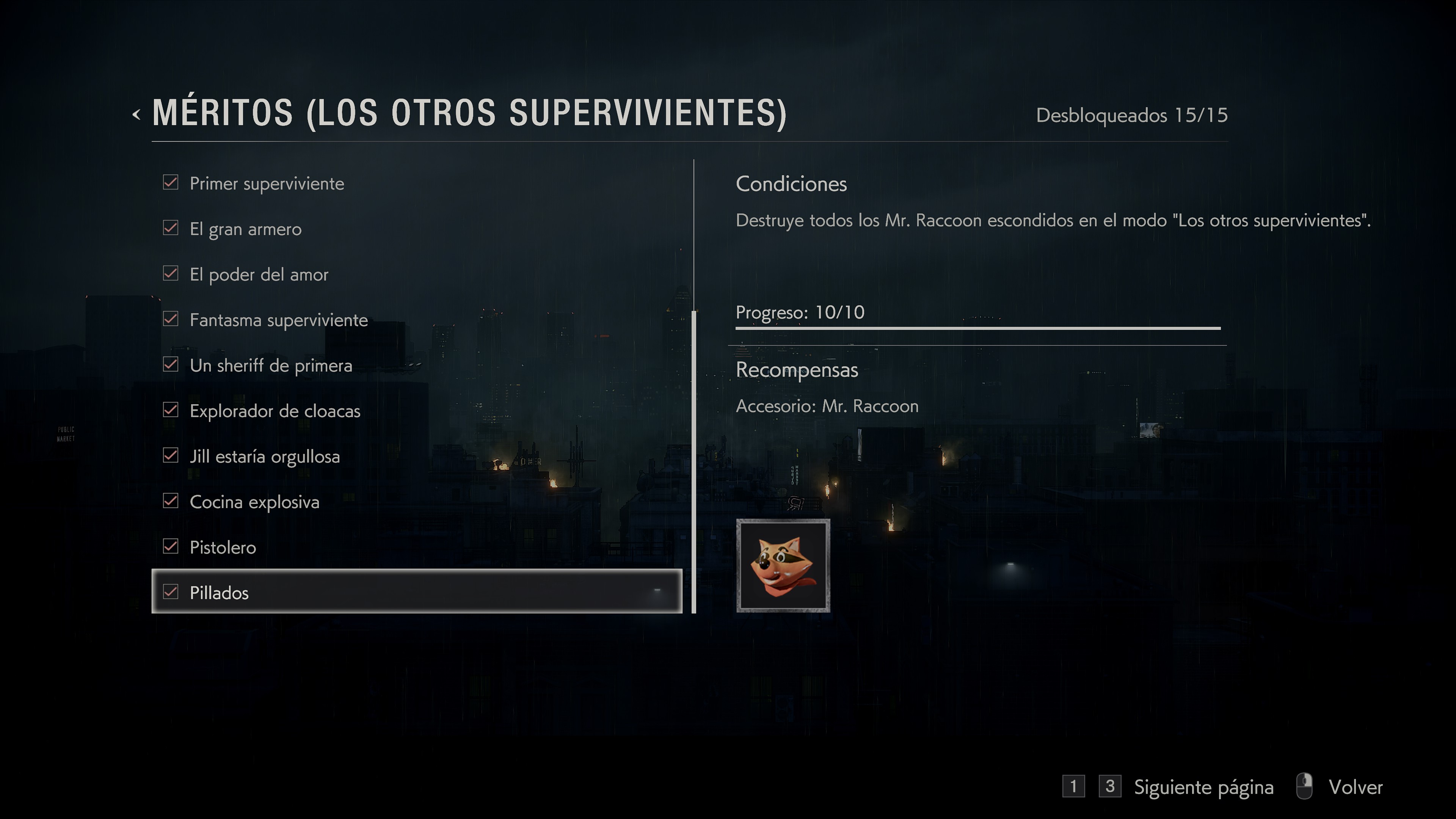 Me quedan 4 trofeos, uno es el de los 14000 pasos que no se como voy a hacerlo, los otros pasarmelo en Harcore con Leon y Claire y el ultimo es pasarse el extra. 4º Superviviente