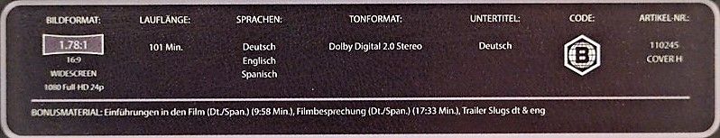 Los extras son los mismos que la edición española dvd: Introducción a la película (audio castellano desincronizado), coloquio posterior sobre la película (audio castellano correcto), ambos del programa de tv Versión Española y la película en su versión, al igual que el dvd español, 4/3 open matte (audio castellano desincronizado). Todos están doblados al alemán, pero a través del menú del reproductor se puede anular dicho doblaje y dejas solo el castellano.