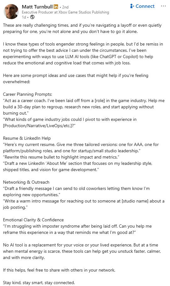 "Un productor ejecutivo de Xbox sugiere en Linkedin que los desarrolladores deberían usar la IA para charlar con ella y lidiar mejor psicológicamente con los despidos..."